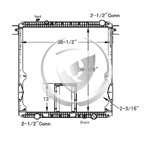 Height: 38.87"Width: 38"Depth: 2.25"Inlet: 2.5"Outlet: 2.5"Notes: Freight Plastic Aluminum Radiator. 4 Pin Mounting 42.125" to Center. 12" X 6" Crank Box. Low Height Tube .5" on .375" centers. EOC 12" and .75" Fitting on Bottom. -