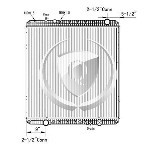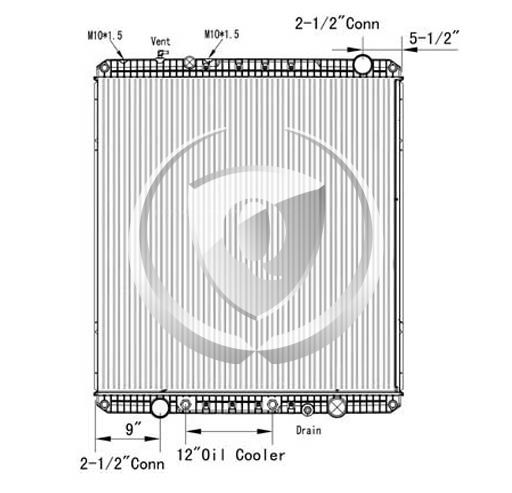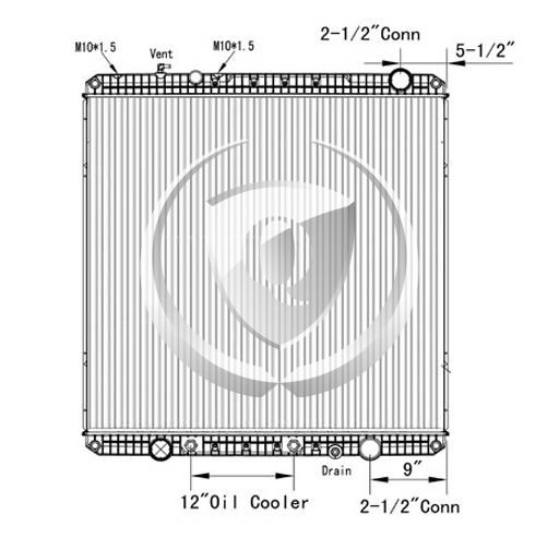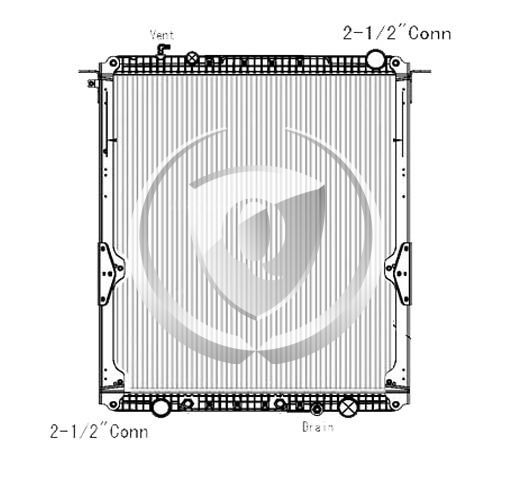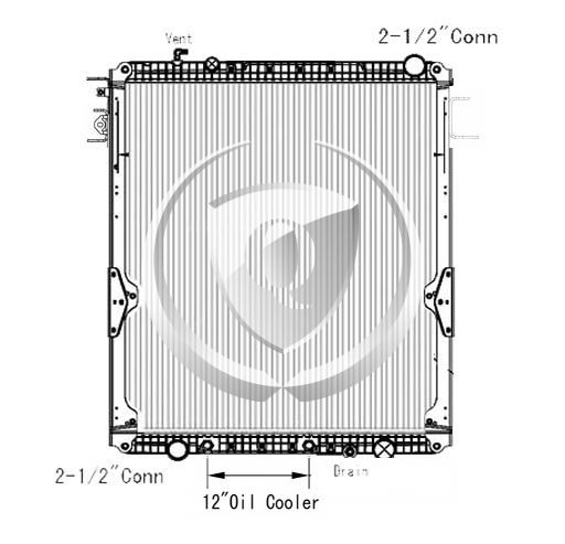 Height: 40.125"Width: 41.50"Depth: 2.25"Inlet: 2.5"Outlet: 2.5"Notes: Freightliner/Sterling Plastic Aluminum Radiator. 12" 5-Plate Transmission Oil Cooler -