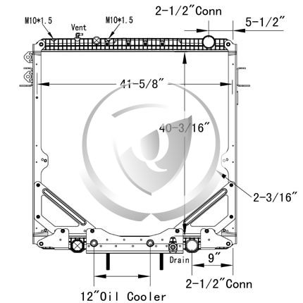 Height: 40.125"Width: 41.50"Depth: 2.25"Inlet: 2.5"Outlet: 2.5"Notes: Freightliner/Sterling Plastic Aluminum Radiator With Frame (Without Frame FLA002281) 12" 5-Plate Transmission Oil Cooler -
