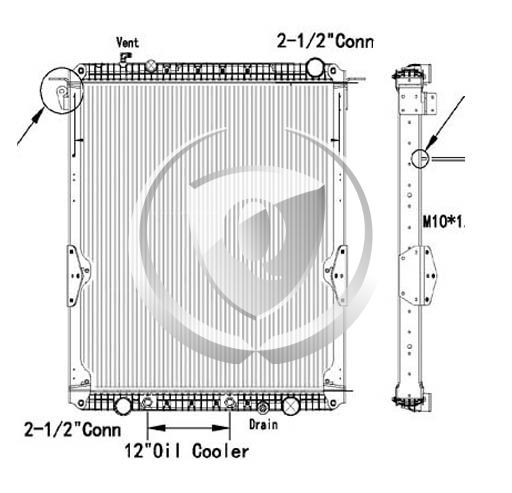 Height: 34"Width: 31.37"Depth: 2"Inlet: 2.5"Outlet: 2.5"Notes: Freightliner Radiator Fits 2008 - 2009 Freightliner M2 with 285 Cummins 18.00 " Oil Cooler Requires the Oil Cooler Fittings to be Included with the Radiator -