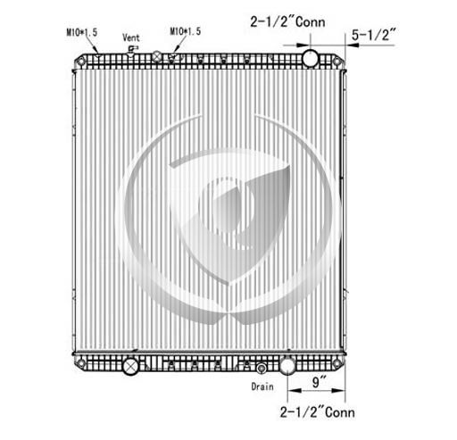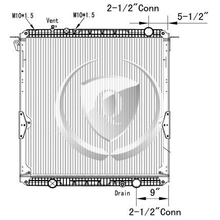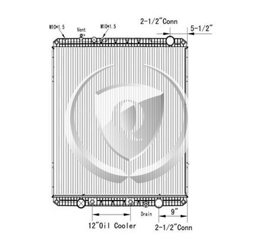 Height: 41.125"Width: 41.50"Depth: 2.25"Inlet: 2.5"Outlet: 2.5"Notes: Freightliner/Sterling Plastic Aluminum Radiator. 12" 5-Plate Transmission Oil Cooler in outlet tank. -
