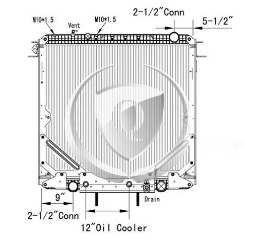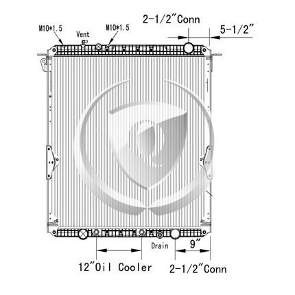 Height: 40.12"Width: 41.50"Depth: 2.25"Inlet: 2.5"Outlet: 2.5"Notes: Freightliner/Sterling Plastic Aluminum Radiator With Frame (Without Frame FLA002265) 12" 5-Plate Transmission Oil Cooler -