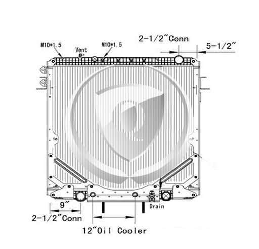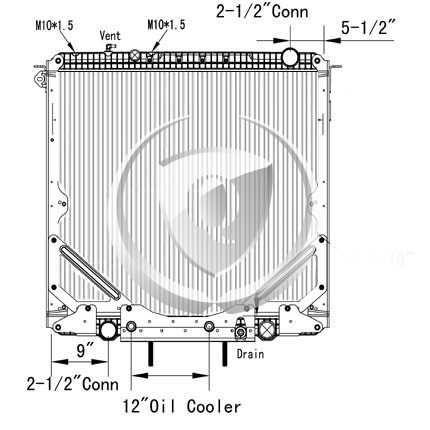 Height: 35.75"Width: 41.50"Depth: 2.25"Inlet: 2.5"Outlet: 2.5"Notes: Freightliner/Sterling Plastic Aluminum Radiator With Frame (Without Frame FLA002273) 12" 5-Plate Transmission Oil Cooler -
