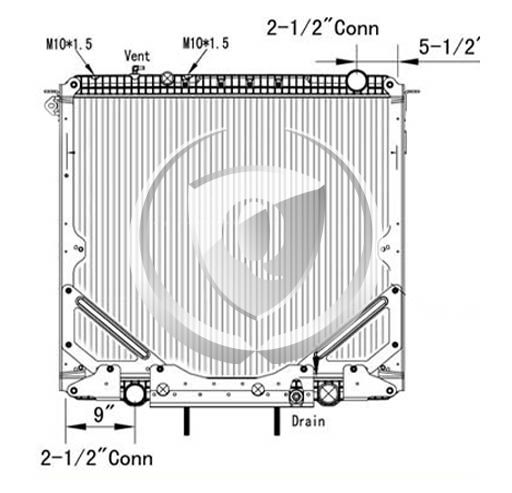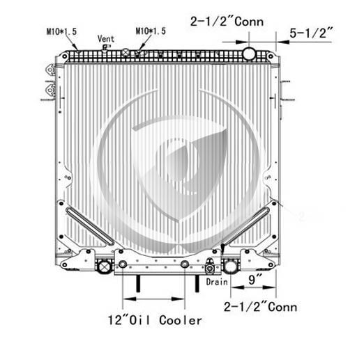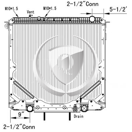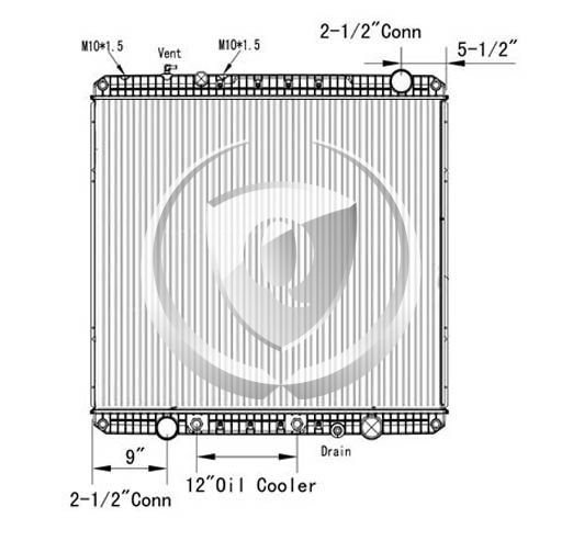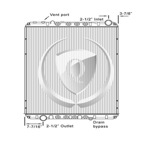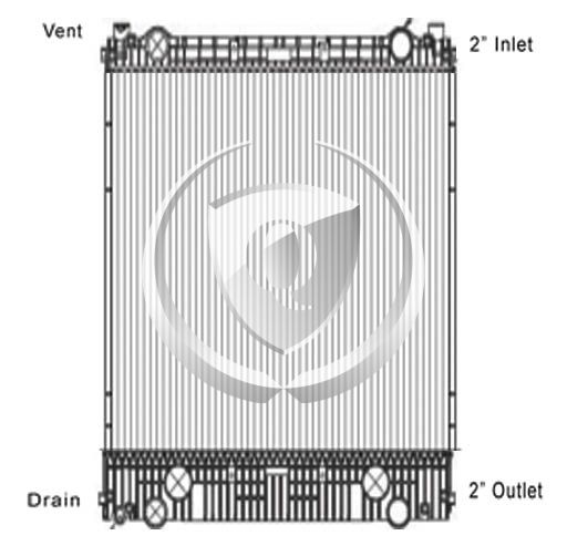 Height: 35.75"Width: 41.50"Depth: 2.25"Inlet: 2.5"Outlet: 2.5"Notes: Freightliner/Sterling Plastic Aluminum Radiator. 12" 5-Plate Transmission Oil Cooler in outlet tank -