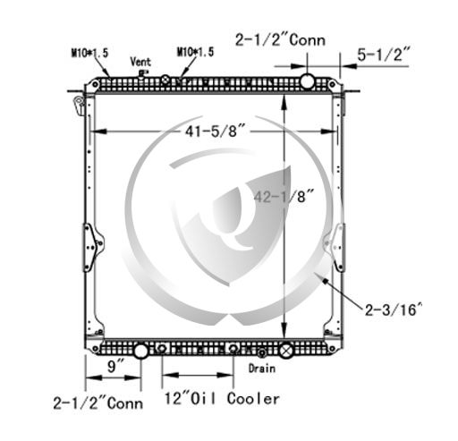 Height: 42.125"Width: 41.50"Depth: 2.25"Inlet: 2.5"Outlet: 2.5"Notes: Freightliner/Sterling Plastic Aluminum Radiator With Frame (Without Frame FLA002277) 12" 5-Plate Transmission Oil Cooler -