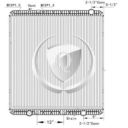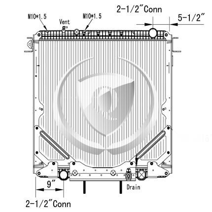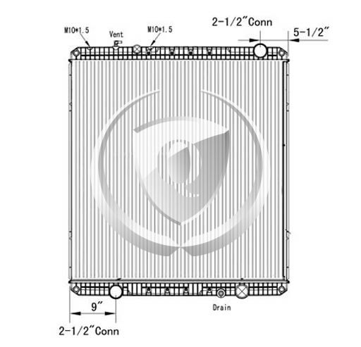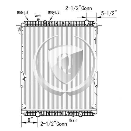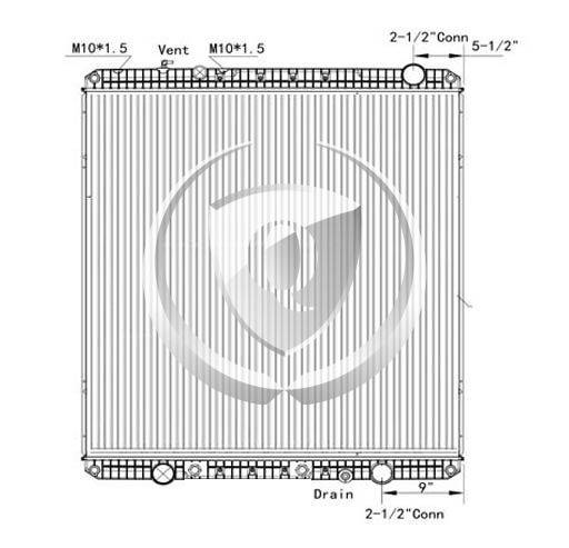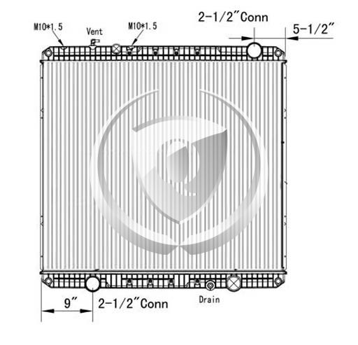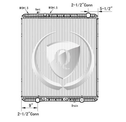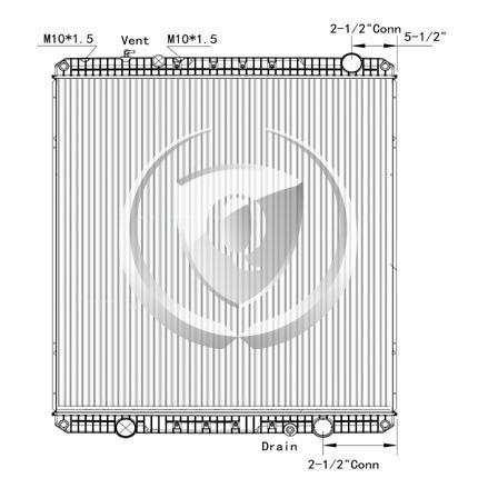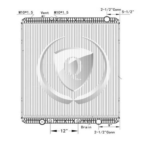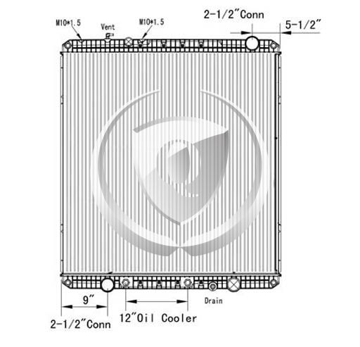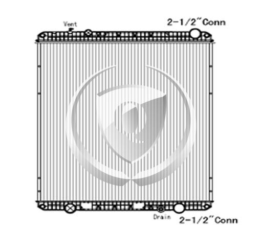 Height: 42.125"Width: 41.50"Depth: 2.25"Inlet: 2.5"Outlet: 2.5"Notes: Freightliner/Sterling Plastic Aluminum Radiator. 12" 5-Plate Tranmission Oil Cooler. -